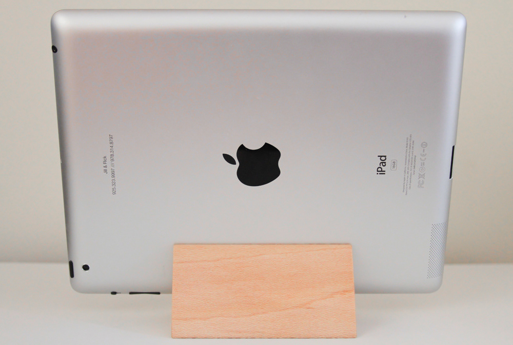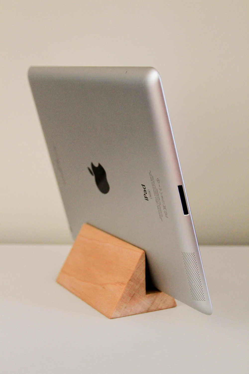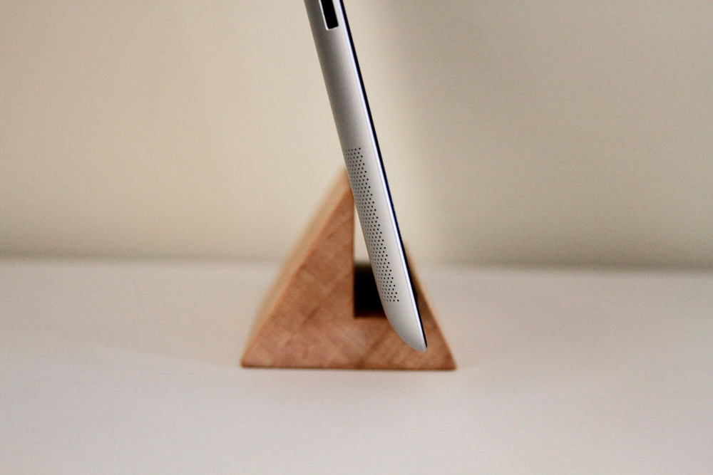 Hand made from sycamore wood, this triangular tablet stand is a simple, natural and sturdy way to keep your tablet device upright for easier viewing, FaceTime, or storage when not in use.